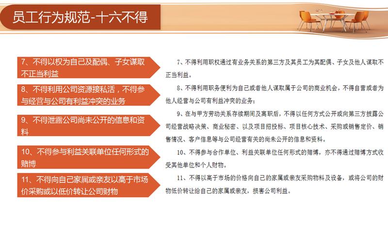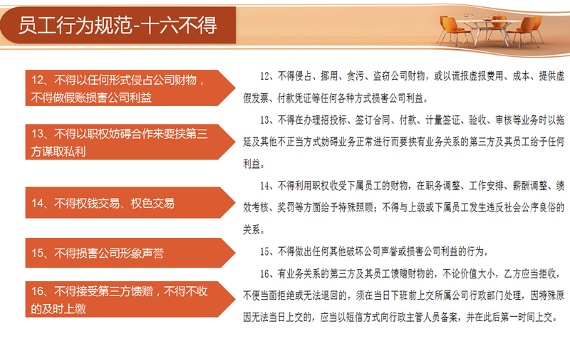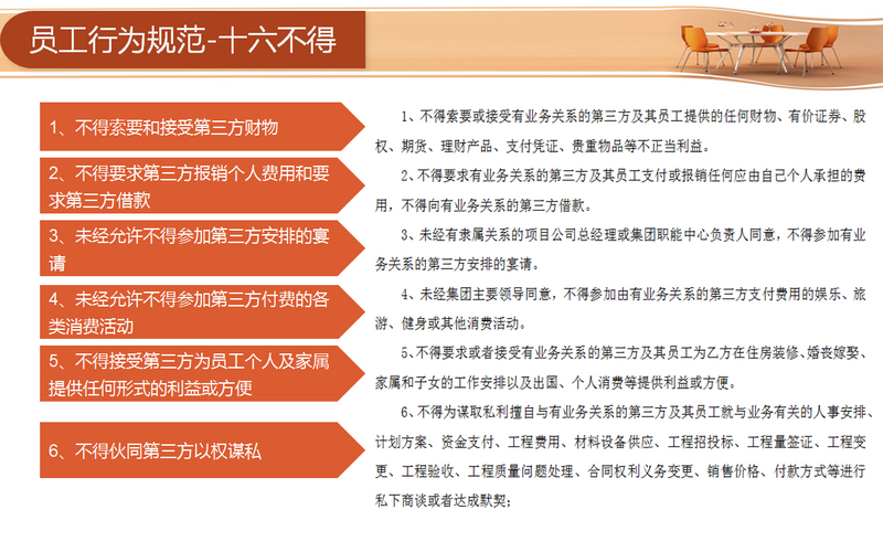宣講環(huán)節主要從四個(gè)方面著(zhù)手:分別為“目的、行為規范約定、違約責任與管理和連帶責任”。員工需要從十六方面規范自身的行為,包括不得索要和接受第三方財物、不得要求第三方報銷(xiāo)個(gè)人費用和要求第三方借款、未經(jīng)允許不得參加第三方安排的宴請等等。