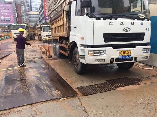 三、設置車(chē)輛沖洗設施,安排專(zhuān)人對出場(chǎng)車(chē)輛進(jìn)行沖洗,防止污染市政道路。