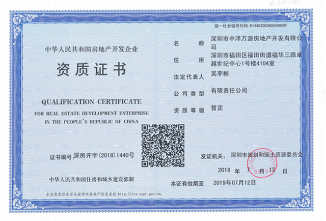 2018年7月20日,深圳市中澤萬(wàn)源房地產(chǎn)開(kāi)發(fā)有限公司(以下簡(jiǎn)稱(chēng)“中澤萬(wàn)源”)成功獲得《中華人民共和國房地產(chǎn)開(kāi)發(fā)企業(yè)資質(zhì)證書(shū)》,這為公司進(jìn)一步做大做強房地產(chǎn)投資業(yè)務(wù)打下堅實(shí)的基礎,也為貝悅匯項目下一步順利獲得預售證提前做好準備。