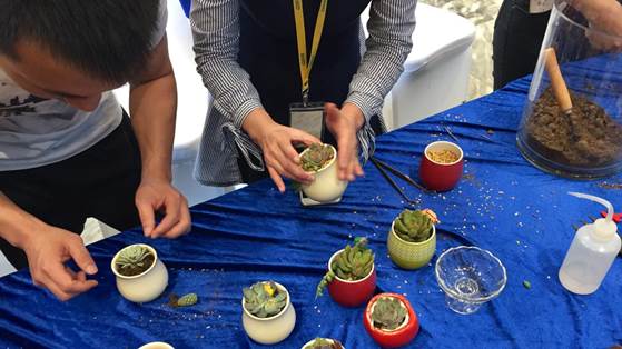 平時(shí)忙于工作的參與者,沒(méi)有充裕的時(shí)間親自動(dòng)手,看到這些植物早已迫不及待地開(kāi)始選盆、培土、植株,一派其樂(lè )融融。大家紛紛自己現場(chǎng)DIY一盆盆多肉植物,然后帶回家。