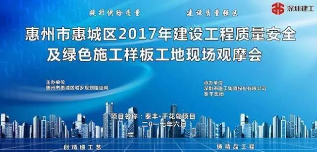 6月8日上午,由惠州市惠城區城鄉規劃建設局主辦,深圳市泰豐投資集團有限公司、深圳市建工集團股份有限公司承辦的——“惠州市惠城區2017年建設工程質(zhì)量安全及綠色施工樣板工地現場(chǎng)觀(guān)摩會(huì )”,在惠城區金山湖泰豐·千花島項目舉行。